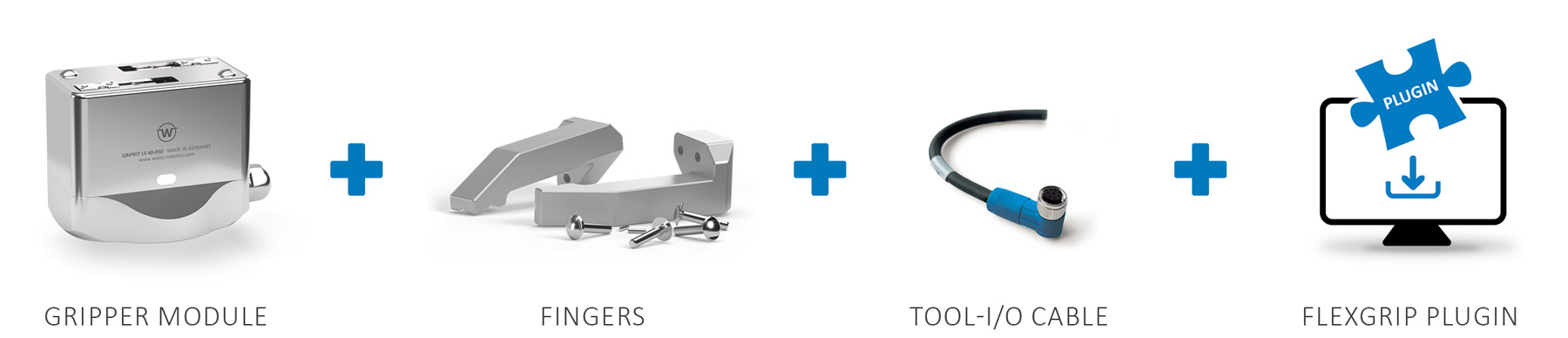 GRIPKIT LS gripping solutions are equipped with FLEXGRIP technology by WEISS ROBOTICS. Ready-to-use plug-ins are available for these robot brands:
