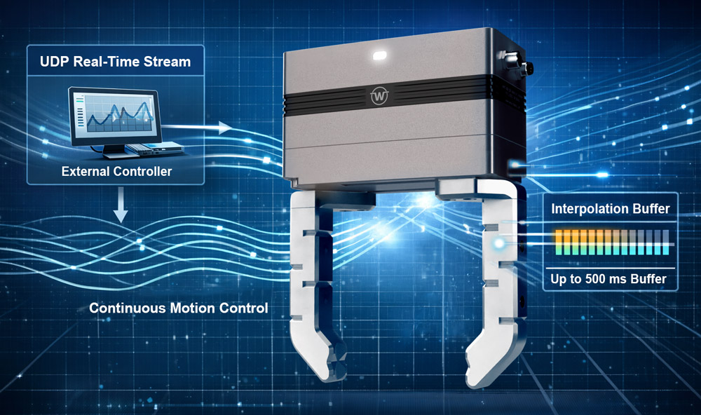 The Motion Stream Interface (MSI) is an optional high-performance technology package for the WPG series from Weiss Robotics. It expands the gripper with a UDP-based real-time streaming interface that allows external controllers to feed movements directly and deterministically into the internal position and force control loops.