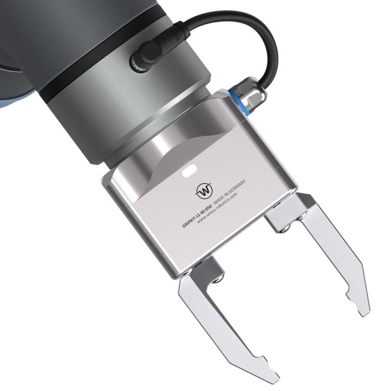 Easy-Clean cobot gripper for laboratory automation, 40 N gripping force, 50 mm stroke, direct operation on the robot's tool I/O connection thanks to the integrated FLEXGRIP interface.